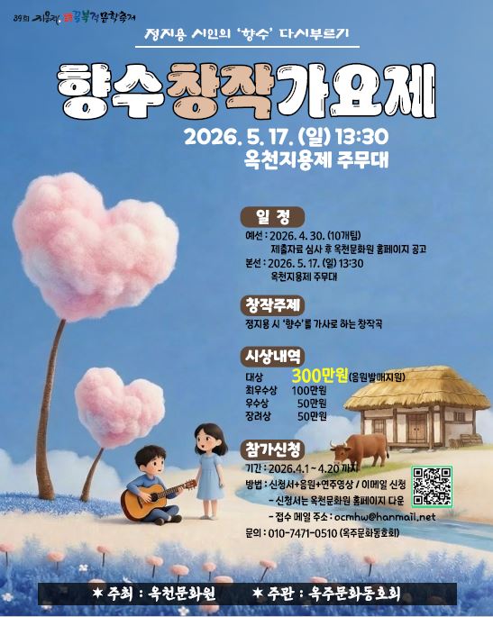 Çâ¼öâÀÛ°¡¿äÁ¦ 1. Çà»ç °³¿ä - Çà »ç ¸í : Çâ¼öâÀÛ°¡¿äÁ¦ - ÁÖ ÃÖ : ¿Áõ±º,¿Áõ¹®È¿ø ÁÖ°ü : ¿ÁÁÖ¹®Èµ¿È£È¸ - °³ÃÖ ¸ñÀû : Á¤Áö¿ë ½ÃÀÎÀÇ ¡¸Çâ¼ö¡¹¸¦ Çö´ë À½¾ÇÀ¸·Î ÀçÇØ¼®ÇÏ¿© »õ·Î¿î ¹®È ÄÜÅÙÃ÷¸¦ ¹ß±¼ 2. Âü°¡ ÀÚ°Ý - ´ëÇѹα¹ ±¹ÀûÀÇ °³ÀÎ ¶Ç´Â ÆÀ(Àοø Á¦ÇÑ ¾øÀ½) - À帣/¿¬·É Á¦ÇÑ ¾øÀ½ 3. Á¢¼ö °î ±âÁØ - ±âÁ¸ Á¤Áö¿ëÀÇ ½Ã 'Çâ¼ö'¸¦ °¡»ç·Î ÇÏ´Â ¼ø¼ö âÀÛ°î - Ÿ °ø¸ðÀü ¼ö»ó ÀÌ·ÂÀÌ ¾ø´Â ÀÛǰ 4. ½Åû ¹æ¹ý - ½Åû ±â°£: 2026. 04. 01 ~2026. 04. 20 24½Ã ¸¶°¨ - ½Åû ¹æ¹ý: E- mail Á¢¼ö ocmhw@hanmail.net - ½Åû ¼·ù 1. Âü°¡ ½Åû¼ 1ºÎ (÷ºÎ ¾ç½Ä) 2. °³ÀÎÁ¤º¸ ¼öÁý¡¤ÀÌ¿ë µ¿ÀǼ 3. À½¿ø ÆÄÀÏ (MP3) 4. ½Ç¿¬¿µ»ó(¾÷·ÎµåURLÁÖ¼Ò Ã·ºÎ) 5. Âü°¡ÀÚ ½ÅºÐÁõ »çº» ¡Ø AIÀ½¿ø ºÒ°¡ - Âü°¡½Åû¼, °³ÀÎÁ¤º¸µ¿ÀǼ ¿Áõ¹®È¿ø ȨÆäÀÌÁö ÀÚ·á½Ç/°øÁö»çÇ× °Ô½Ã (´Ù¿î·Îµå : https://www.okcc.or.kr/default/m4/menu1.php) 5. ½É»ç °á°ú 5.1.¼·ù½É»ç(¿¹¼±)°á°ú : 26³â 4¿ù 30ÀÏ(¸ñ) ¿Áõ¹®È¿ø ȨÆäÀÌÁö ÀÚ·á½Ç/°øÁö»çÇ× °ø°í - 10°³ ¼±Á¤ÆÀ °ø°í ¹× °³º° ¿¬¶ô ¿¹Á¤ - ½Åû¼ ¹× °á°ú ´Ù¿î·Îµå QR